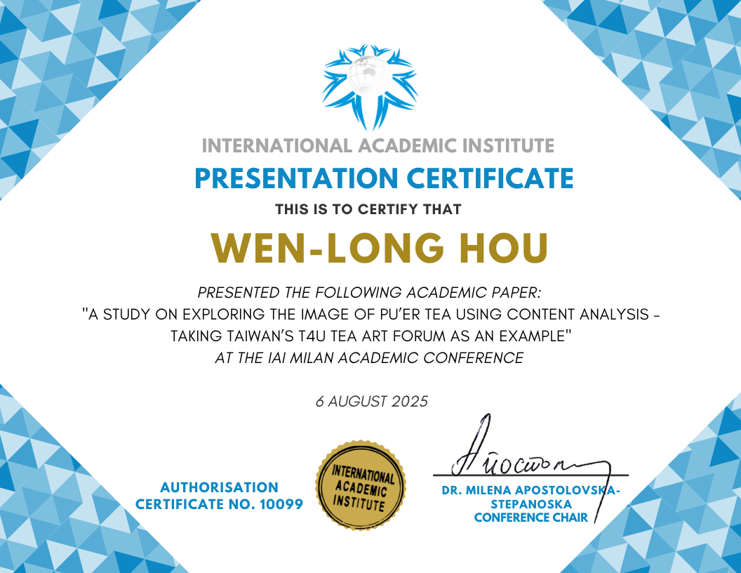 2025 年 8 月,我受邀參加義大利米蘭 (Milan) IAI 國際學術研討會,以全英文發表我的普洱茶研究,將台灣獨特的「T4U 茶藝論壇」文化資料帶到國際學界,作為我推動「東方茶文化 × 西方科學」對話的重要里程碑。